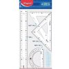 Juego geométrico de plástico. Contiene 1 regla de 30 centímetros, 2 escuadras de 18 y 13 centímetros + un semicírculo.